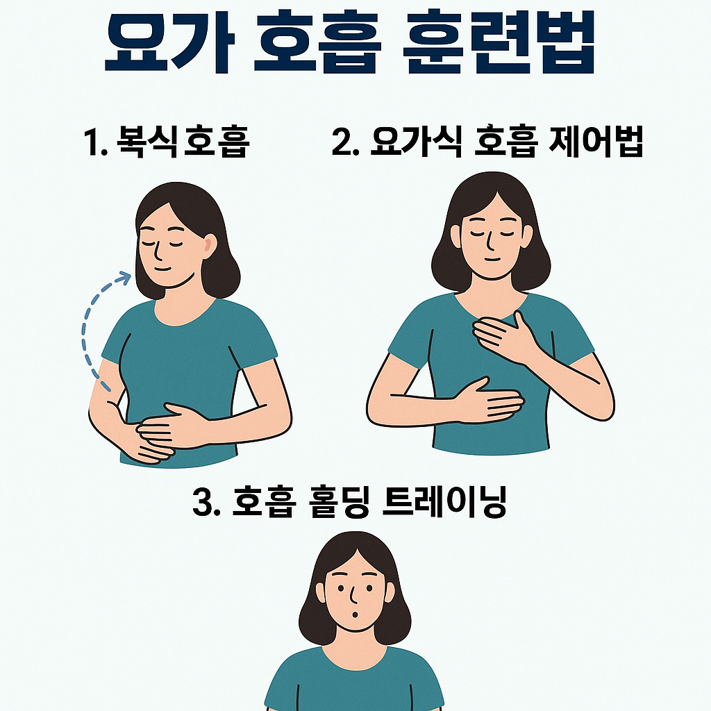 | 호흡 조절 | 복식호흡, 숨참기 | 프라나야마(호흡법) |
