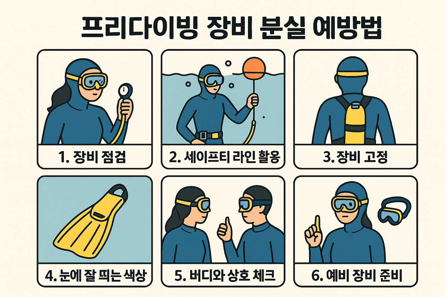프리다이빙에서 장비 분실은 사소한 부주의에서 시작됩니다. 하지만 간단한 습관과 예방 장비만으로 대부분의 상황을 방지할 수 있습니다.